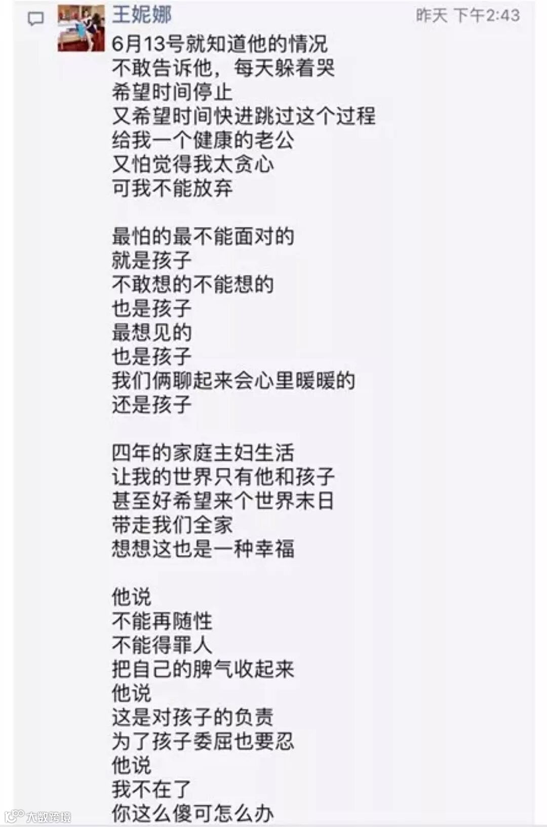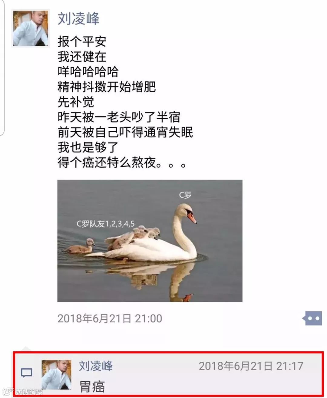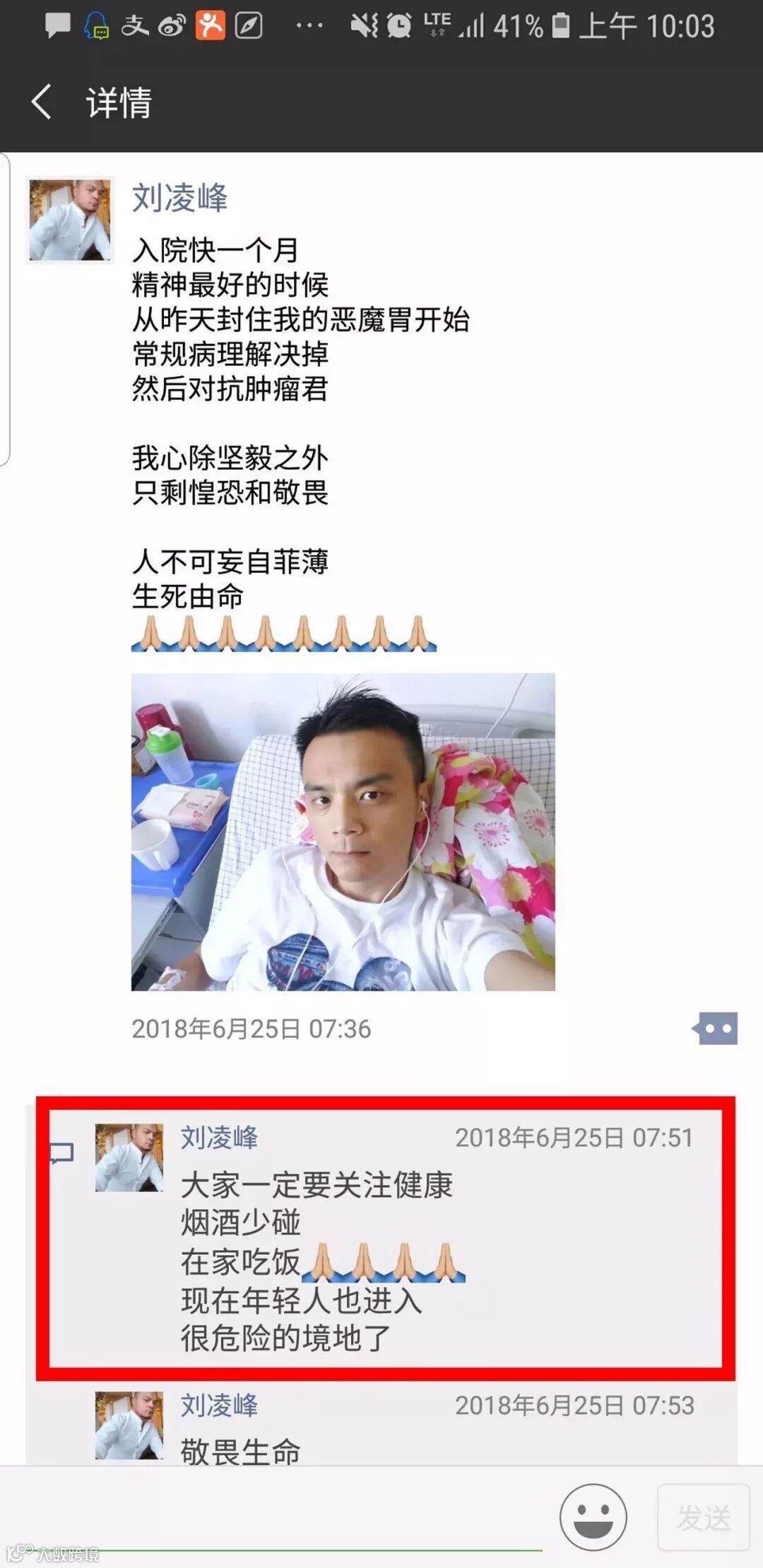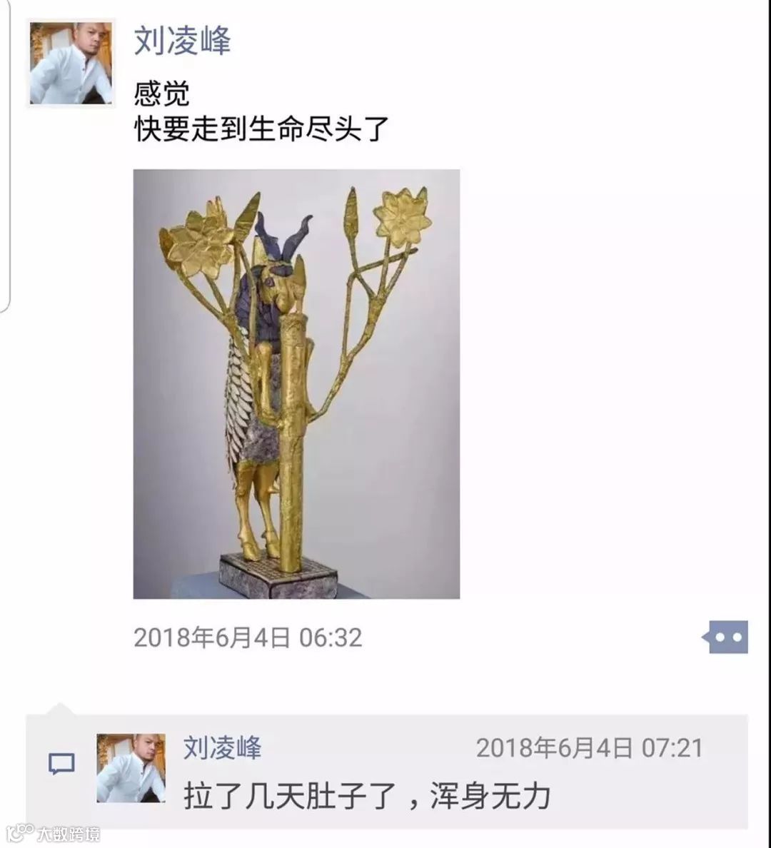 身体不舒服的他,在朋友圈调侃说:“感觉快要走到生命尽头了”。