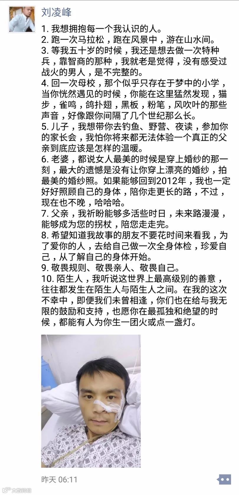 8月1日下午,刘凌峰拿起手机,吃力地给妻子发微信: