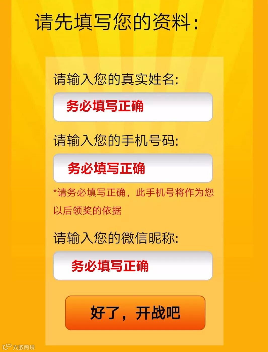 2:点击马上开始后,系统会让您填写“您的姓名,电话号码及微信昵称”,请填写正确的信息,方便后续核对获奖者,如果填写信息为无效信息,视为自动放弃。