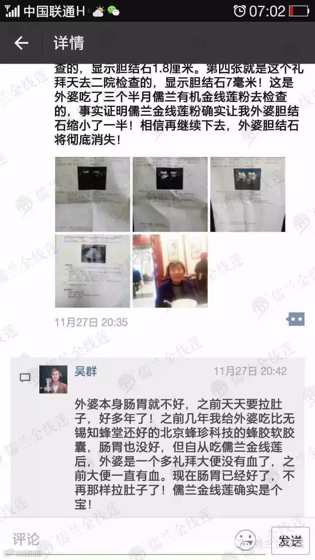 客户反馈:不单单胆结石小了,外婆本来肠胃不好,之前天天要拉肚子,好多年了,自从喝了儒兰金线莲后,肠胃好了,也不会一直拉肚子,大便也没有血了