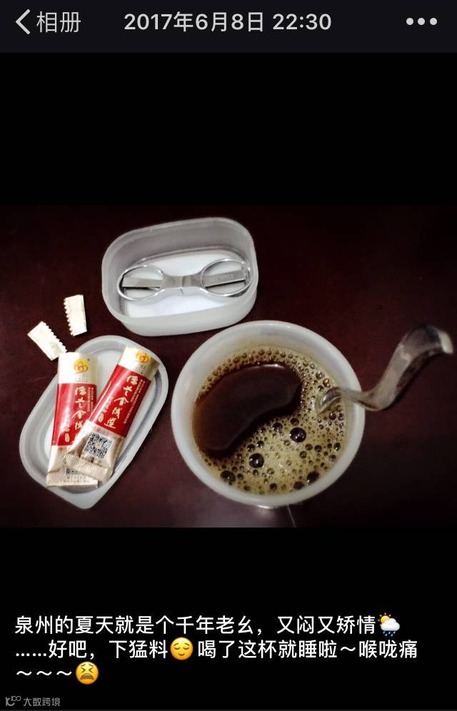 近一周的气候非常糟糕,一会闷热令全身冒汗,一会起风令毛孔全竖,就是没有一场干脆的大雨,身体终于没能扛住,喉咙干烧得厉害,连续两个半夜不得不醒来喝水“灭火”。刚开始只想着多喝温水便能化解,却忽略这是身体免疫力下降的表症,实在难受得不行,且开始出现连续打喷嚏的情况,知道是感冒的初期症状,连忙干咽小半包金粉,睡前加量一次性泡了2包金粉,由于前面的拖延还是错过了快速消炎的时机。当晚,还是因为咽干难受,不得不醒来再喝了一杯温水。
