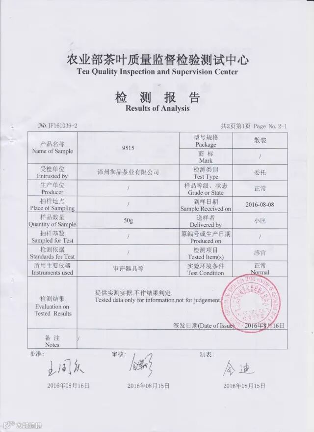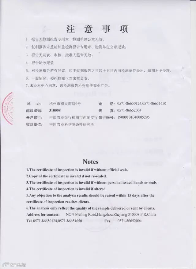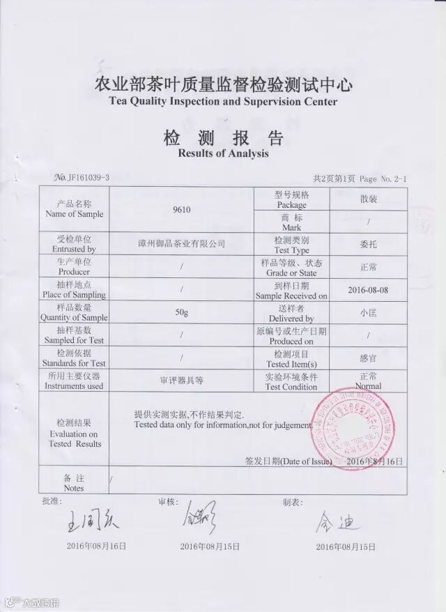 农业部茶叶质量监督检测中心书面检测报告: