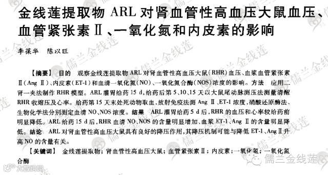 该实验结果表明:金线莲提取物ARL显著降低血浆AngⅡ、ET含量,同时血清NO和NOS含量明显升高,这些可能就是金线莲提取物ARL治疗高血压病的机理,提示ARL具有保护血管内皮损伤,改善血管内皮功能的作用。