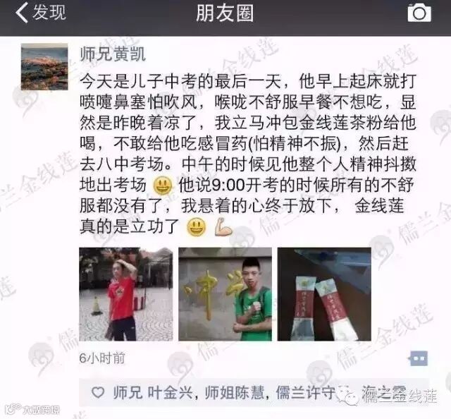 关键的中考,考生不小心受凉,人不舒服!聪明的爸爸一包儒兰金线莲粉,让考试精神抖擞的参加完中考!棒棒的!
