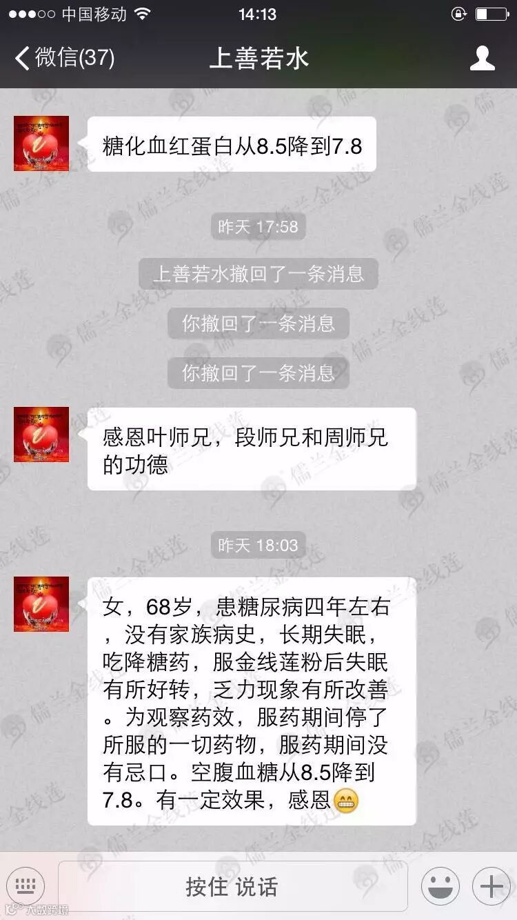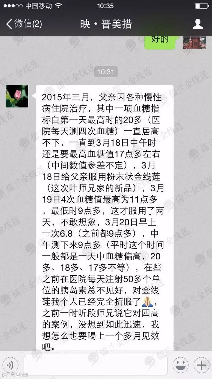 糖尿病是世界难题,但“管住嘴、迈开腿”,从日常生活习惯加以彻底改造,对糖尿病人来说非常重要;金线莲不是降糖药,其着眼于人体阴阳平衡调整,需要一个漫长过程,对于平时不常服用西药的人见效会快一些,比如3-6个月,长时间服用西药的,由于耐抗药性等原因,可能会慢一些;糖尿病本身不可怕,最怕出现并发症,从这个角度讲,糖尿病人血糖值只是其中一个指标而已,血糖不正常的人,一般甘油三脂、转氨酶等等指标正常的可能性不大,喝金线莲之后,一般血糖之外的其他指标会先恢复正常!