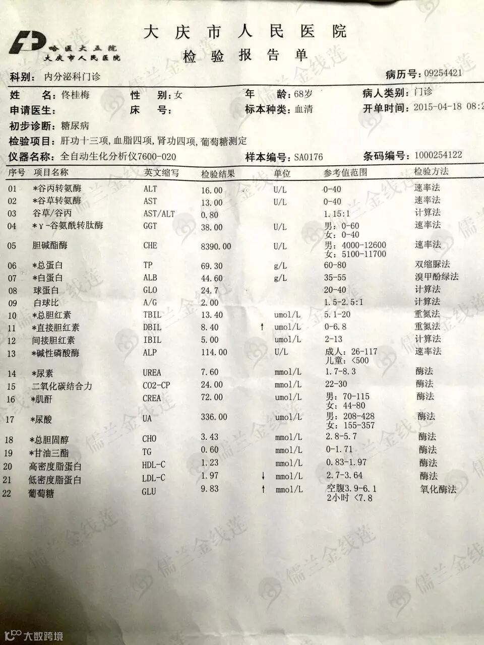 总胆固醇:7.4↑---6.94