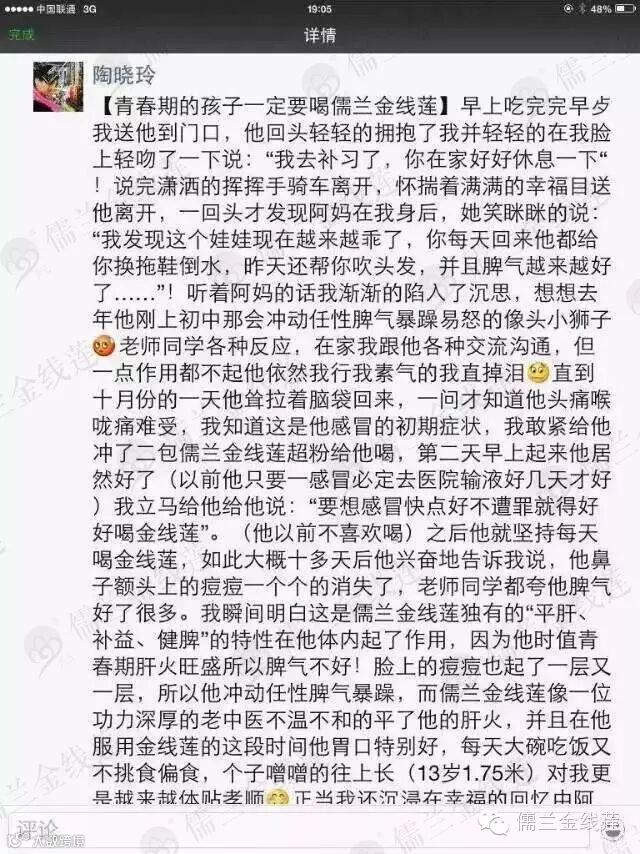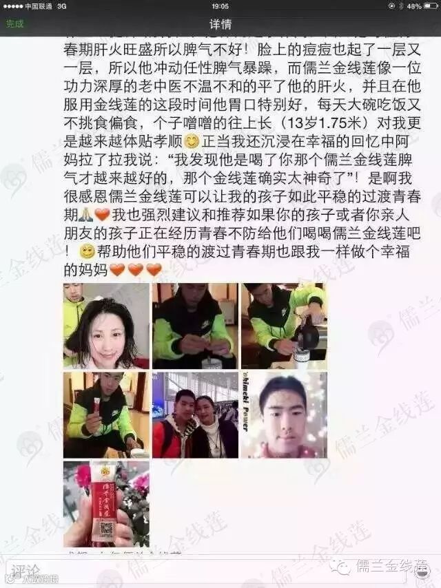 四川代理商陶晓玲的儿子,是位正值青春期的小伙子,自从喝儒兰金线莲痘痘消了之后,主动坚持喝,脾气也变好了,对爸爸妈妈更加体贴孝顺了!