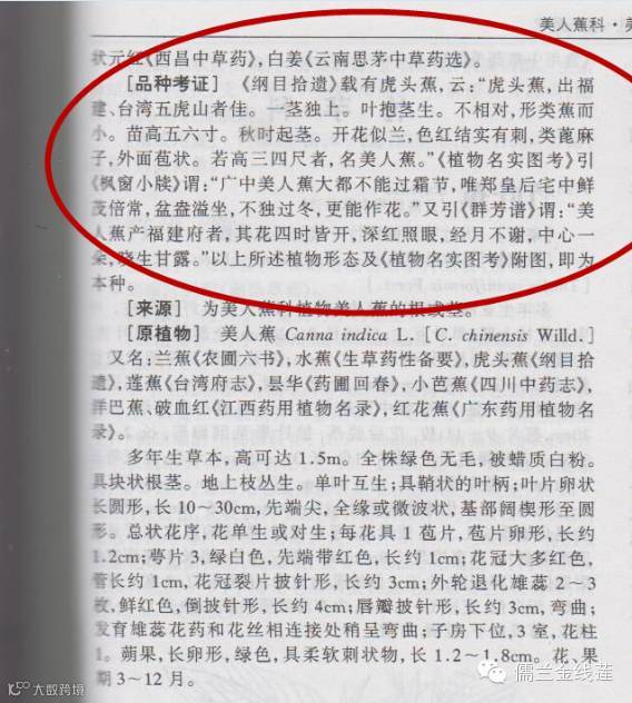 上面说的虎头蕉也名为------美人蕉根,并非为金线莲,我们也查阅了其他典籍:《中华本草第8卷----666记载》(如图):