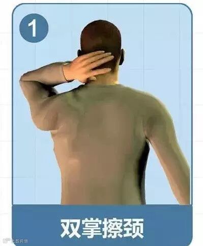 用左手掌来回摩擦颈部,口中默念8下后,开始 捏后颈。然后换右手。有助于颈部放松。