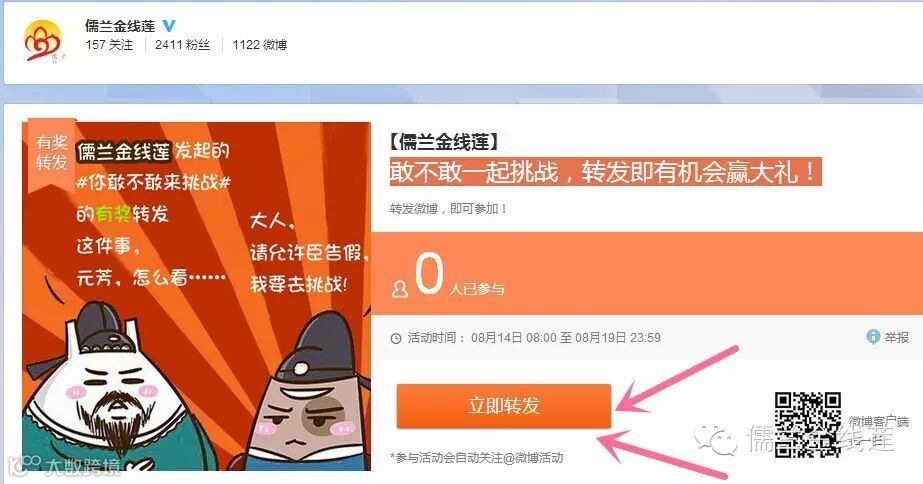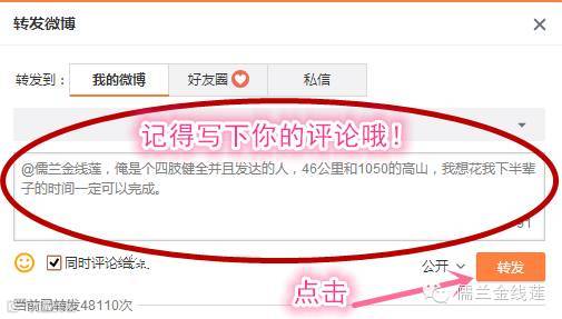 进入@儒兰金线莲后,可在主页找到---置顶的那条微博点击进入马上参与,进入到活动界面,点击立即转发,写下评论(如:@儒兰金线莲 俺是个四肢健全并且发达的人,46公里和1050米的高山,我想话我下辈子的时间一定可以完成!)写完后点击转发,即可参加活动!