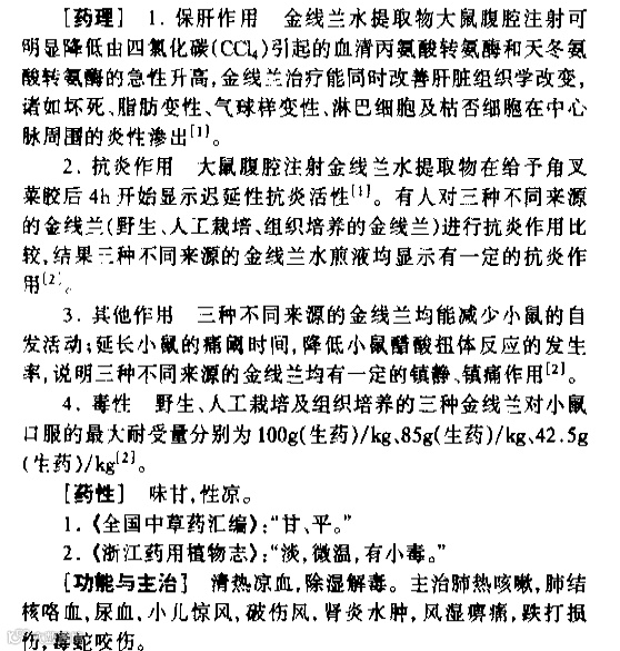 4.毒性 野生、人工栽培及组织培养的三种金线兰对小鼠口服的最大耐受量分别为100g(生药)/kg、85g(生药)/kg、42.5g(生药)/kg。