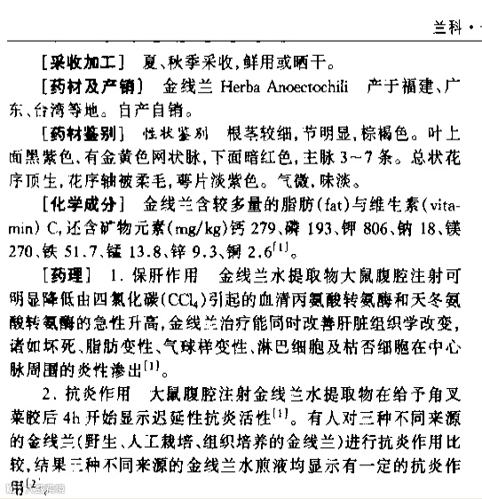 【药理作用】 1.保肝作用 金线兰水提取物大鼠腹腔注射可明显降低由四氯碳(CCl4)引起的血清丙氨酸转氨酶和天冬氨酸转氨酶的急性升高,金线兰治疗能同时改善肝脏组织学改变,诸如坏死、脂肪变性、气球样变性、淋巴细胞及枯否细胞在中心脉周围的炎性渗出。