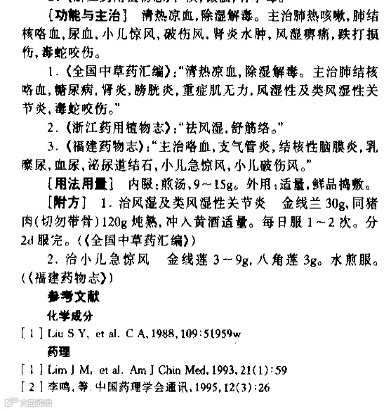 【各家论述】《新华本草纲要》:全草:味甘、性平。有凉血平肝、清热解毒的功能。用于肺痨咳血、糖尿病、肾炎、膀胱炎、小儿惊风、毒蛇咬伤。