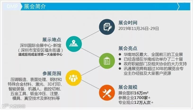 2019大湾区工业博览会暨第22届DMP国际模具、金属加工、塑胶及包装展,由香港讯通展览公司主办。首届大湾区工博会成为“粤港澳之核,大湾区之心”的大型工业博览会。2019年素有“华南工业展览第一展”之称的DMP展如今升格为16万平方米的“大湾区工业博览会”。本届工博会展出面积16万平方米,设有7大主题展区、11个专题馆,预计共有超过1700家企业同台竞技,汇聚全球顶尖高精度生产机械设备、工业自动化、智慧工厂解决方案、人工智能机器人、3D打印、模具加工及塑胶机械设备等工业链条上的“名牌老将”“排头尖兵”参展,逾八成参展企业为海内外知名品牌。展商及买家来自世界各地,包括:中国两岸三地、日本、韩国、意大利、美国、德国、瑞士、英国、奥地利、瑞典、新加坡、法国、以色列、土耳其等国家和地区。