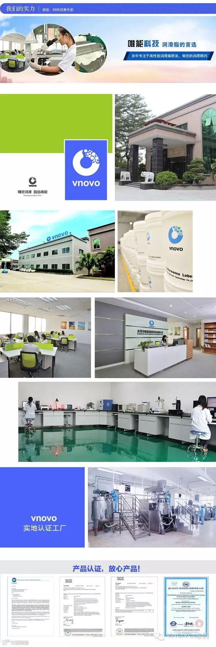 东莞市唯能润滑科技有限公司成立于2007年,立足于“世界工厂”东莞市,占地面积4500平方米,是一家专业从事特种润滑油脂研发、生产、销售于一体的高新技术企业。唯能经过多年的持续发展,已获得多项润滑产品的发明专利,拥有先进的润滑实验室和检测中心,并引进日本生产设备和工艺,是中国最专业的特种油脂的研发生产基地之一。