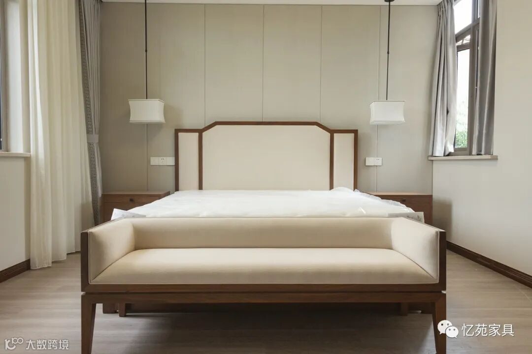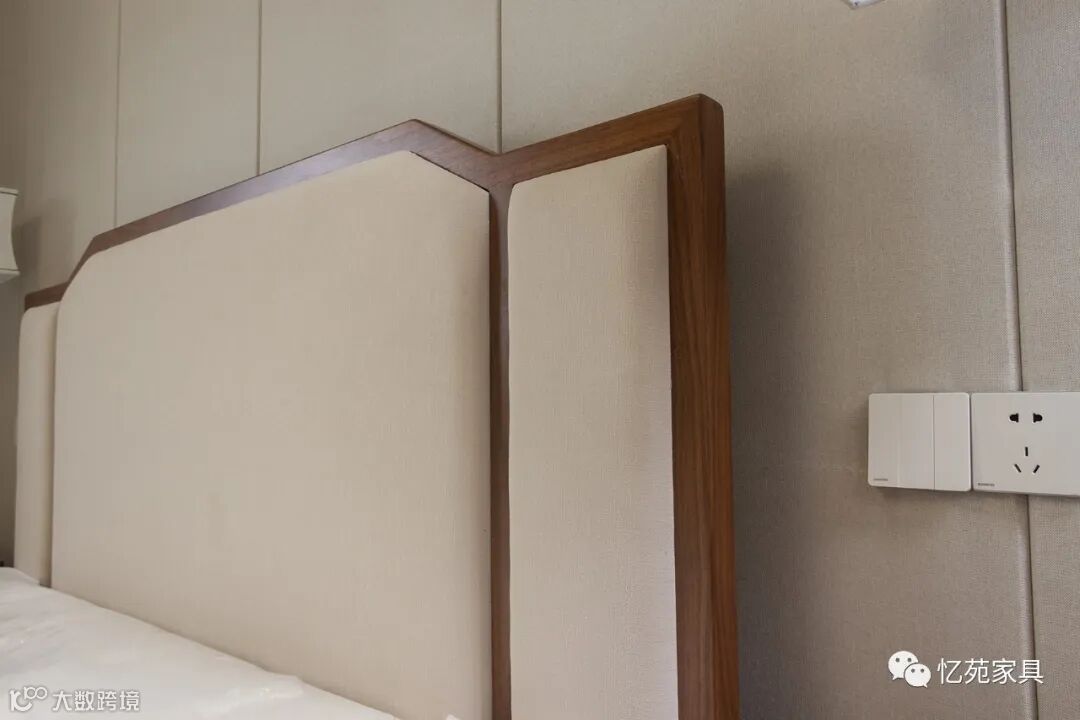 主人卧室大床采用黑胡桃木主体框架,靠背选用素色亚麻布与暖色的装饰空间呼应,禅意自然,拥有一种不流于表象的意境之美,为主人提供了一个舒适温馨的卧室体验。