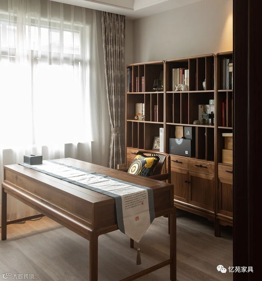 三个独立的书柜组合成一面背景墙,活动的隔板任意调节,合理划分布局,收纳功能超强,书籍分类摆放,合心又顺手,精致的摆件在书籍的包围中,增添一丝雅趣与韵味,禅意造型的书桌、符合人体工程学的传统梳背椅,给空间带来古色古香的典雅韵味。