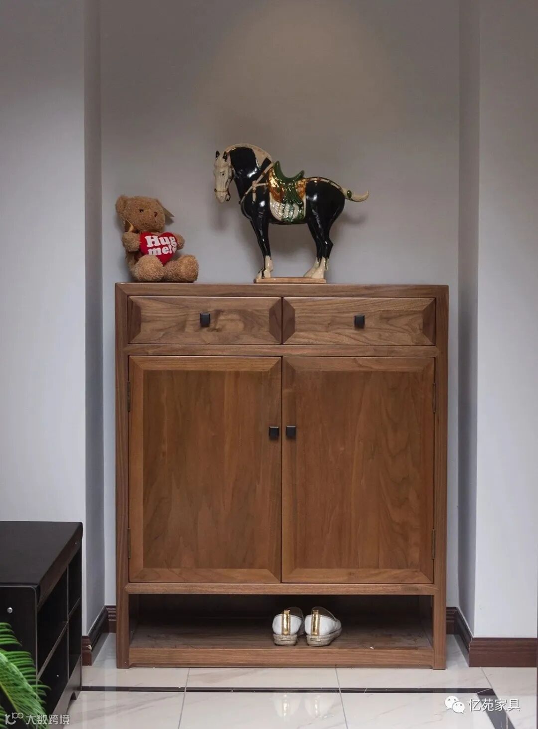 进门处定制的独立小玄关柜,当作鞋柜,台面摆上陶艺唐三彩马,象征着马到成功,布置成端景柜,让回家更加有仪式感。