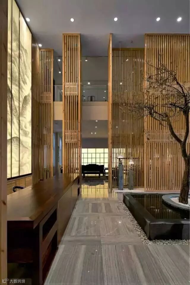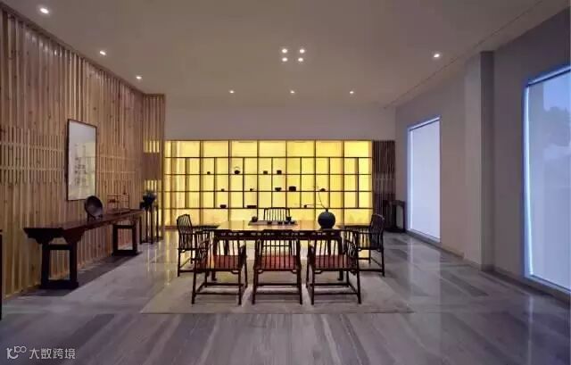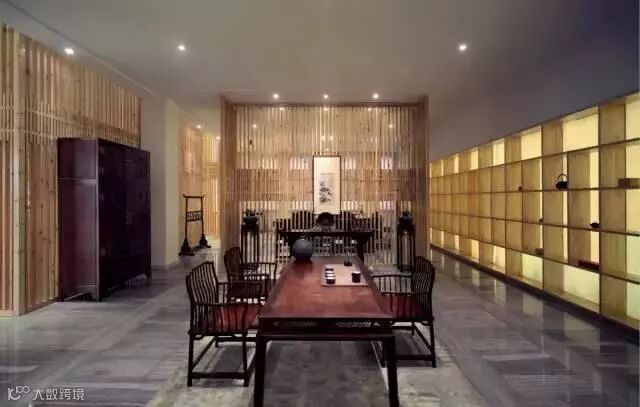 大厅中的《富春山居图》背景,在深色木格栅的背后静静的散发着柔和的光晕,无用师卷的布局、笔墨、意象与我们所追寻的禅意相得益彰。黑灰色的地面,隐隐反射着光、影、景。