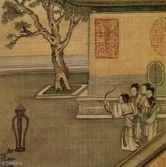 射粉团是一种唐代宫廷比较盛行的游戏。《开元天宝遗事》记载:“宫中每到端午节,造粉团、角黍,贮于金盘中。以小角造弓子,纤妙可爱,架箭射盘中粉团,中者得食。盖粉团滑腻而难射也。都中盛行此戏。”角黍就是粽子,粉团则是类似麻团的一种点心,用糯米制成,外裹芝麻,置油中炸熟。