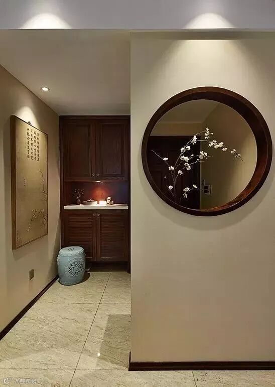 玄关,一进来就有一面墙挡着,这样客厅就不会一下看到底了,听说这在风水上是有讲究的。墙面中间采用圆形镂空设计,蛮有韵味的。