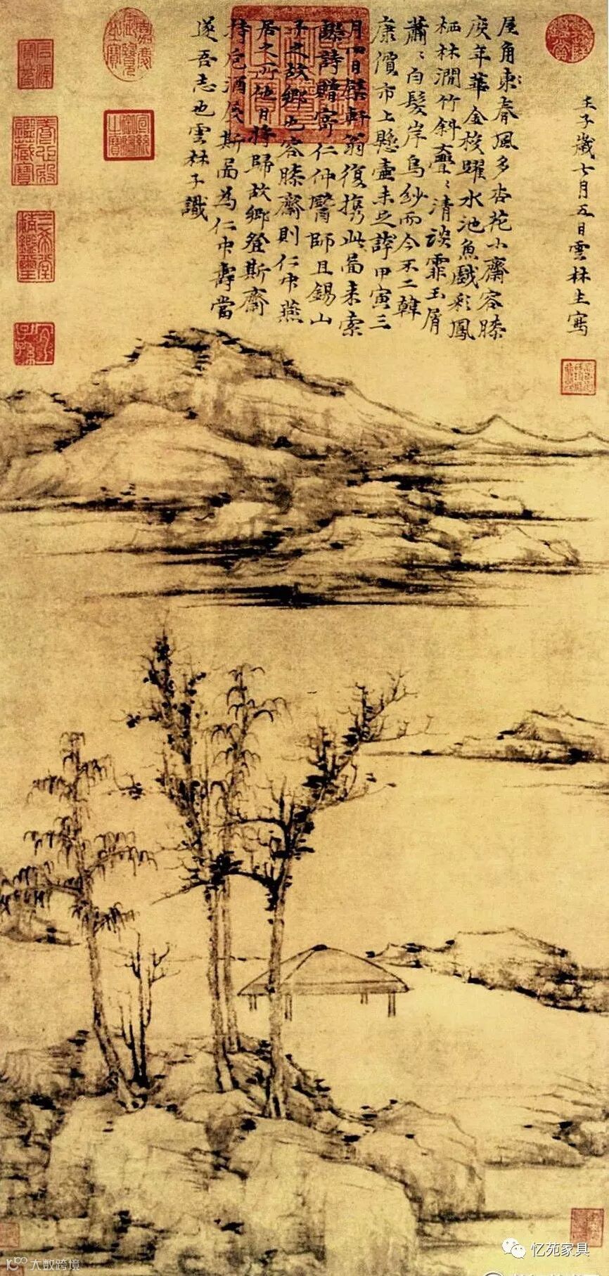 本次展厅设计与新锐设计师倾力合作,经过激烈的思想碰撞之后,双方一致认为应该从中国山水精神中寻找灵感。这幅元代倪瓒的《容膝斋图》无论从意境还是构图都十分契合本次主题,方寸之间彰显博大胸怀,自然与建筑融为一体。