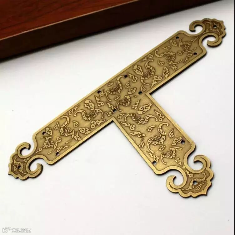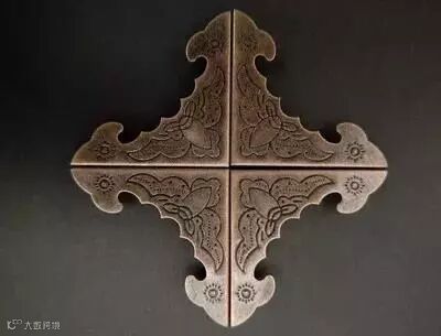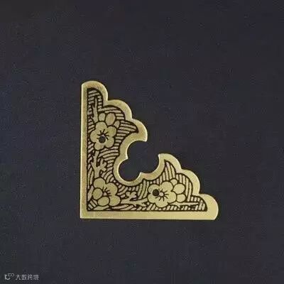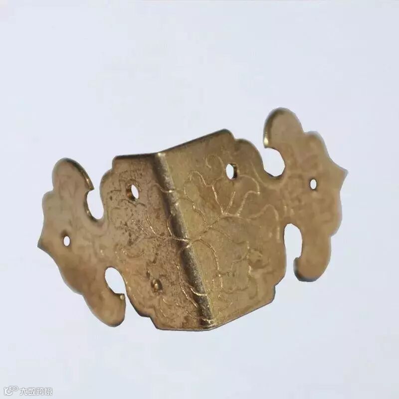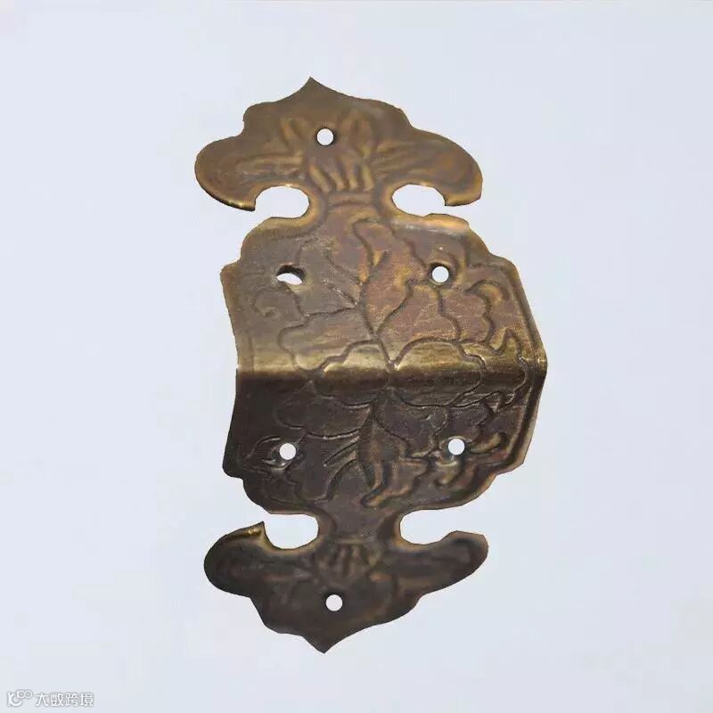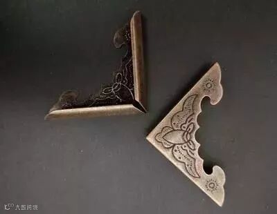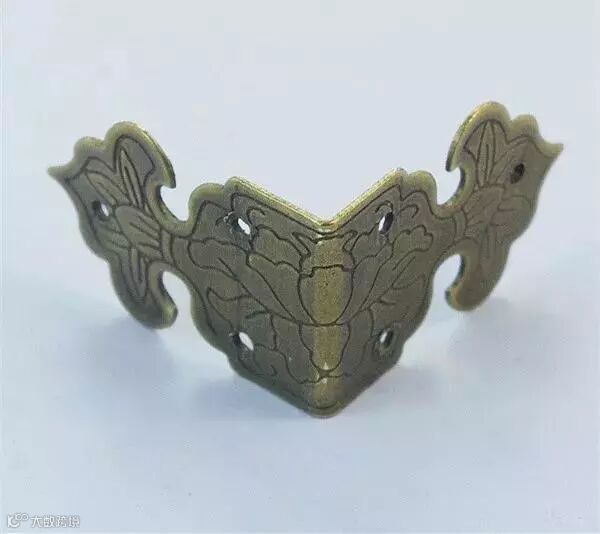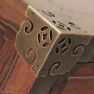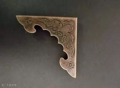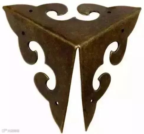 包角家具铜饰件。是用来保护家具外轮廓边角的三角形铜饰件,三个面角为等腰直角三角形。古典家具匣、箱等上下四角都有包角作装饰,形式别具一格。
