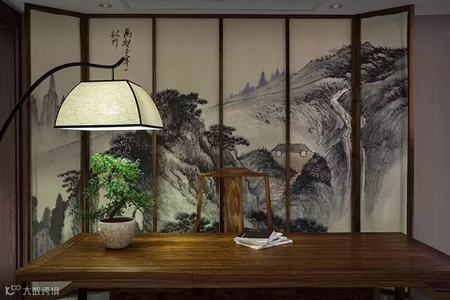 造景以山水屏风、陶瓶盆景、