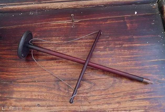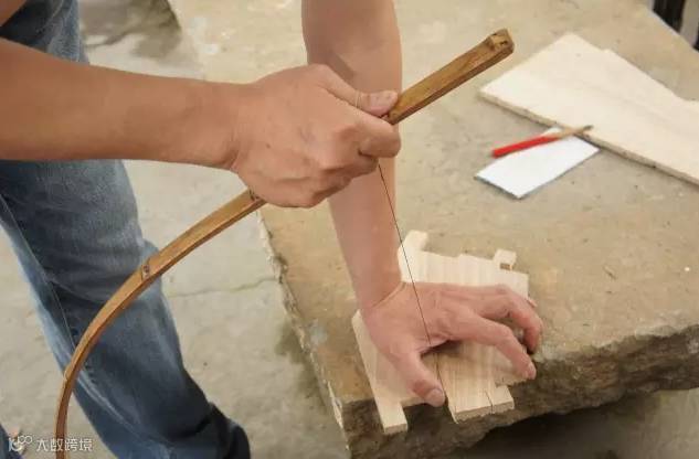 其实就是利用成直角的两根木棒,前后拉动绞绳钻孔。