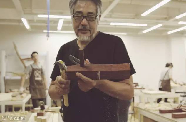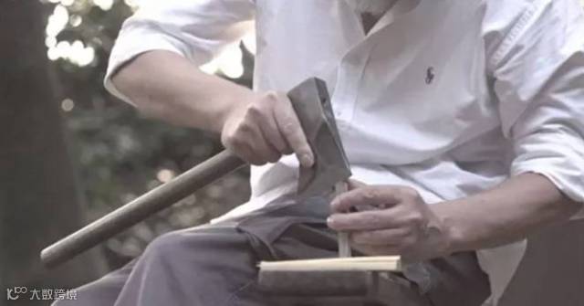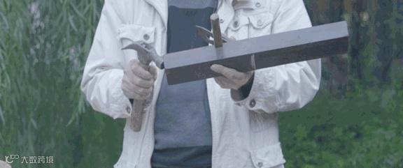 左手拿着刨子,右手用锤子敲击刨刀入,敲击尾部木头退,以此调整刨刀的入退。