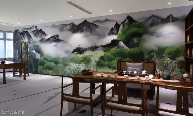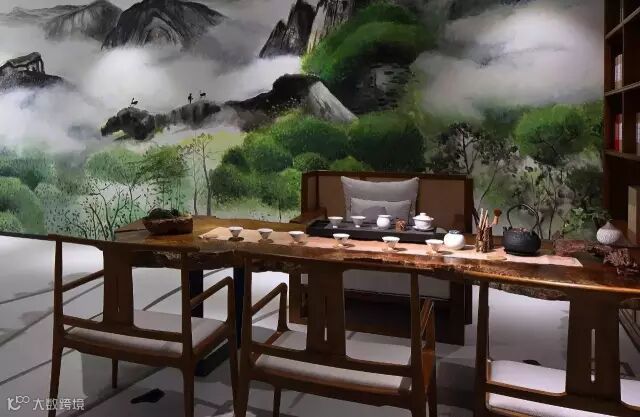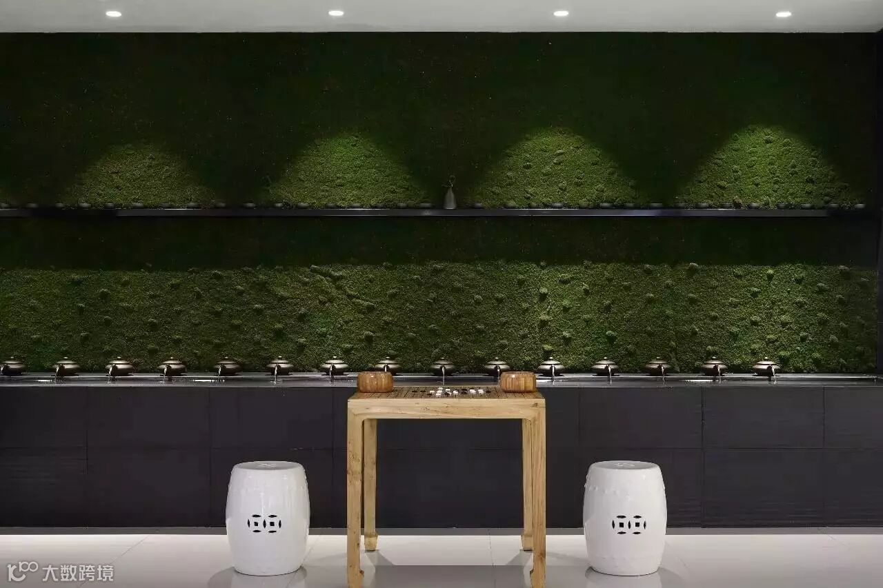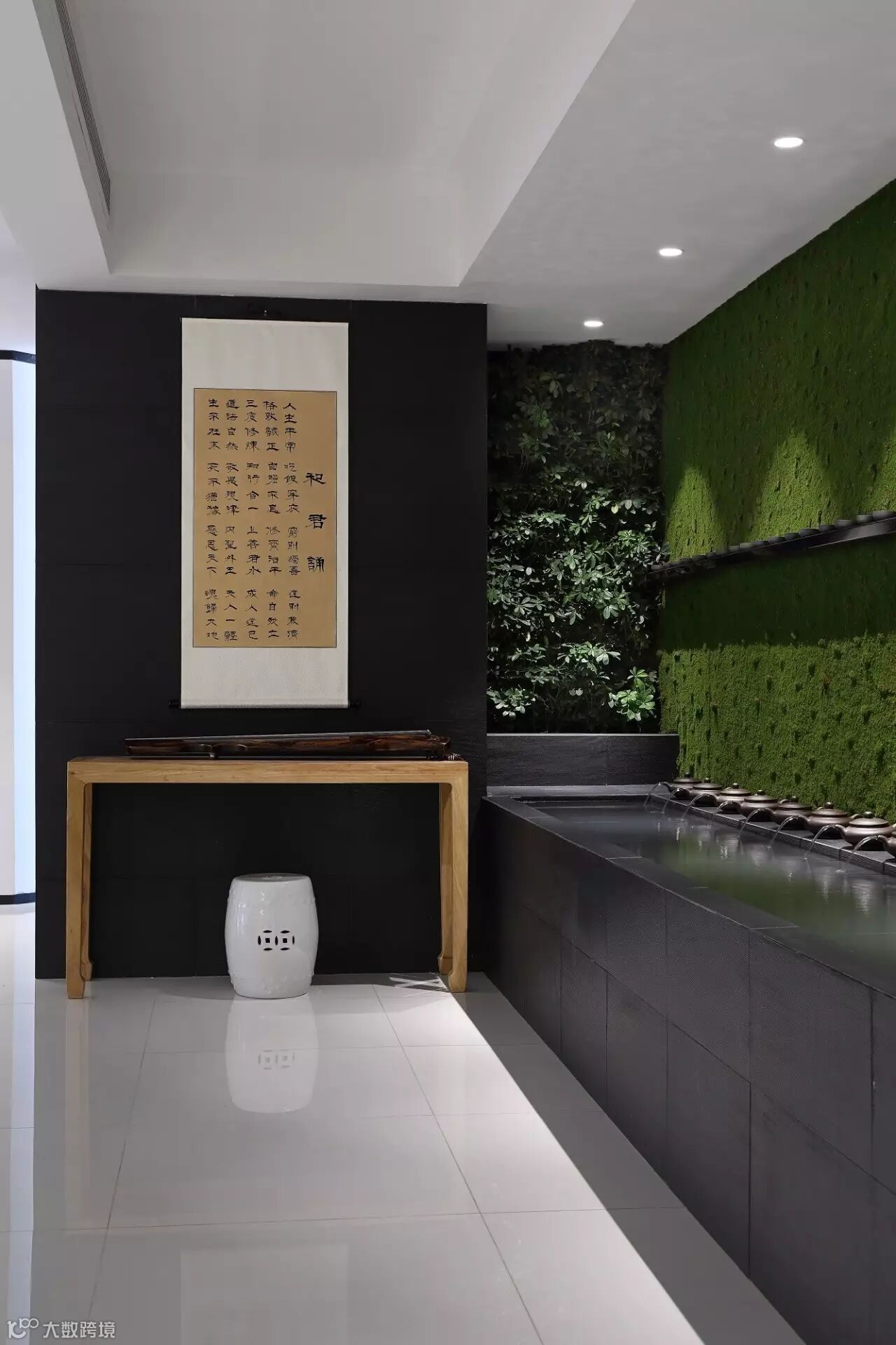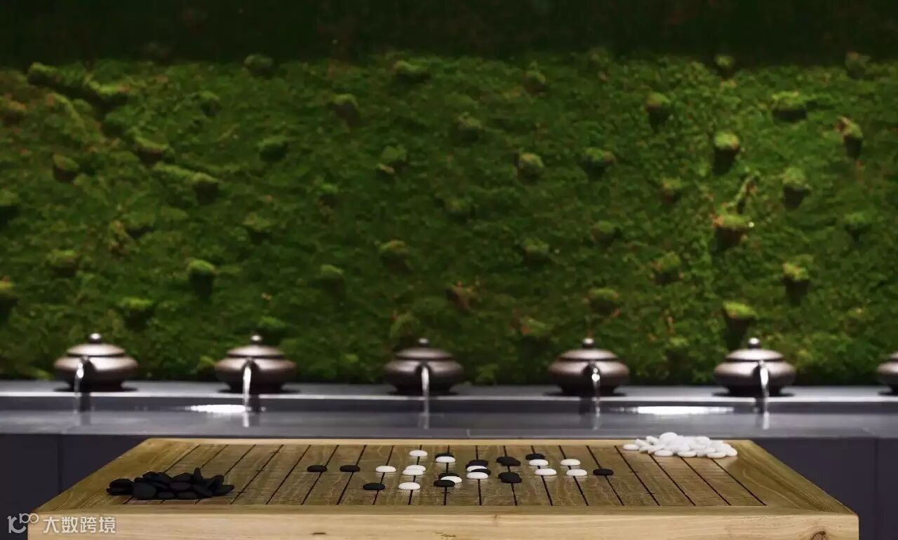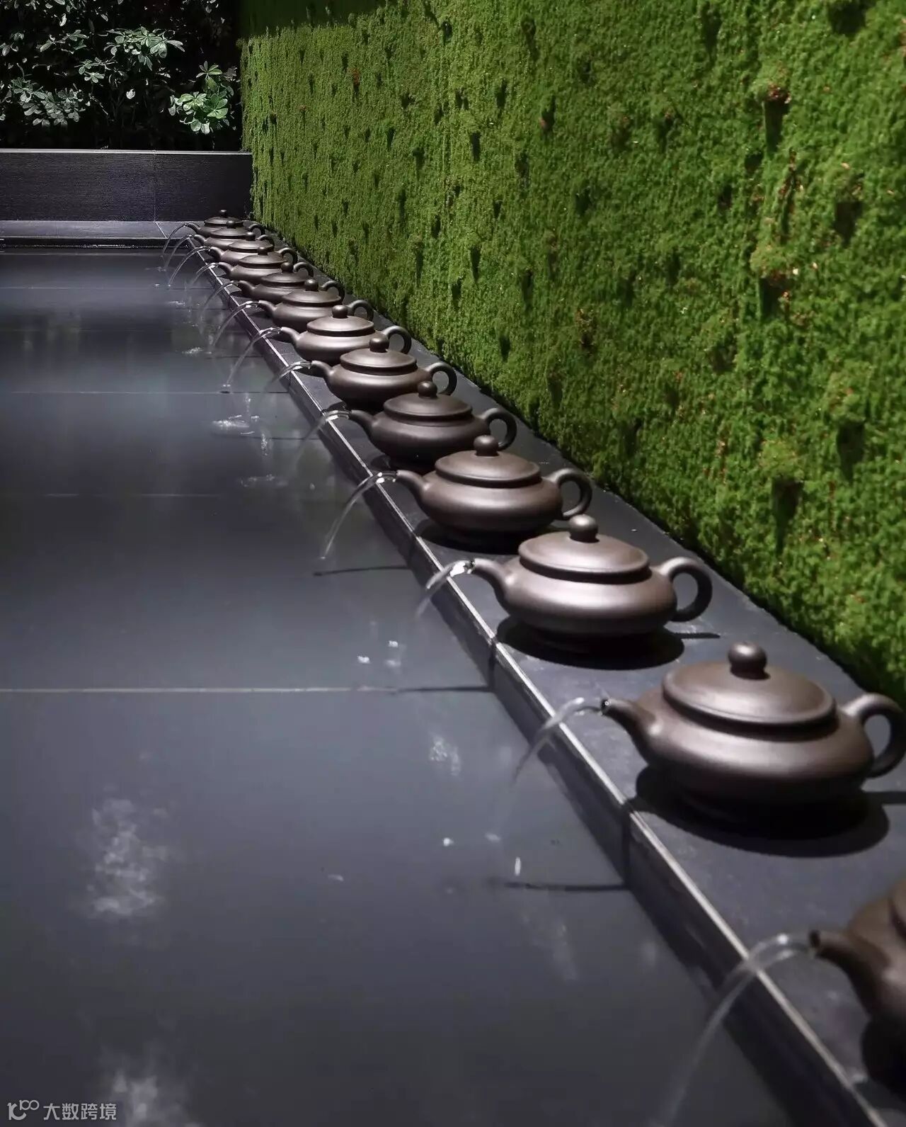 青苔墙下,十几把紫砂陶壶吐水若泉,汇水入池,汇财如水。水池旁边摆一盘棋,你且看它,恍若有两高人静思对弈,正谋进退围破,你自观棋不语,但听见水声汩汩,响而不躁、闻而不远。池波轻漾,灯光照射下波光粼粼,映到屋顶天花板上,亦真亦幻,摇摇曳曳。