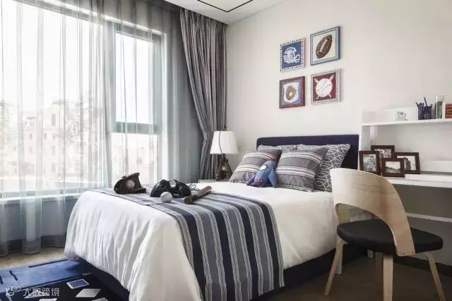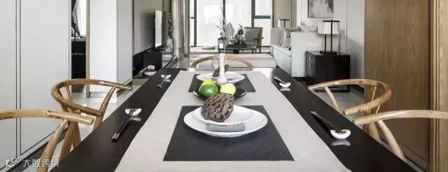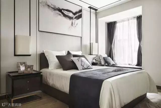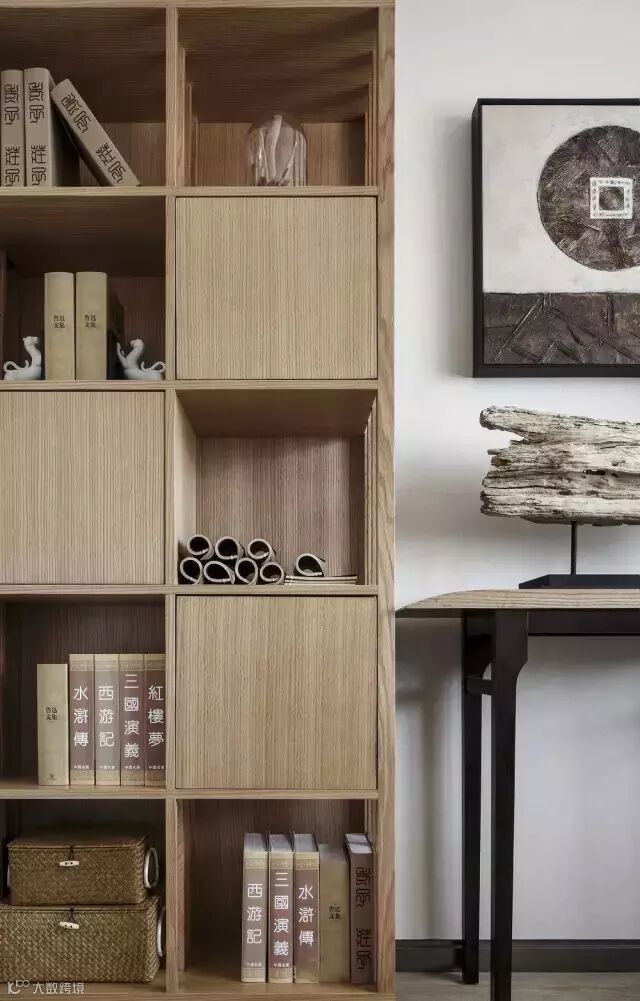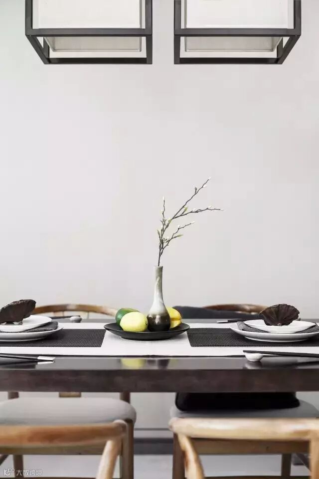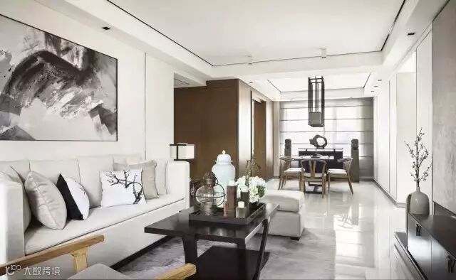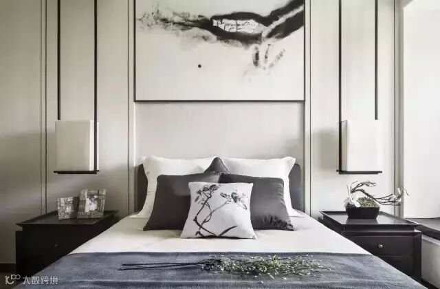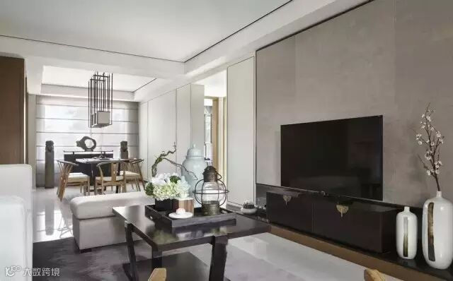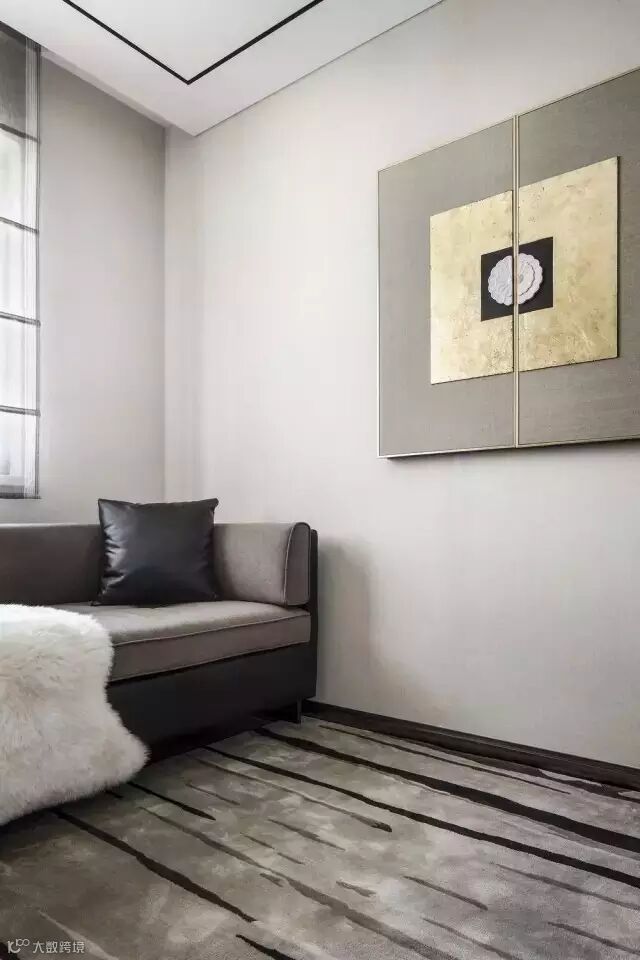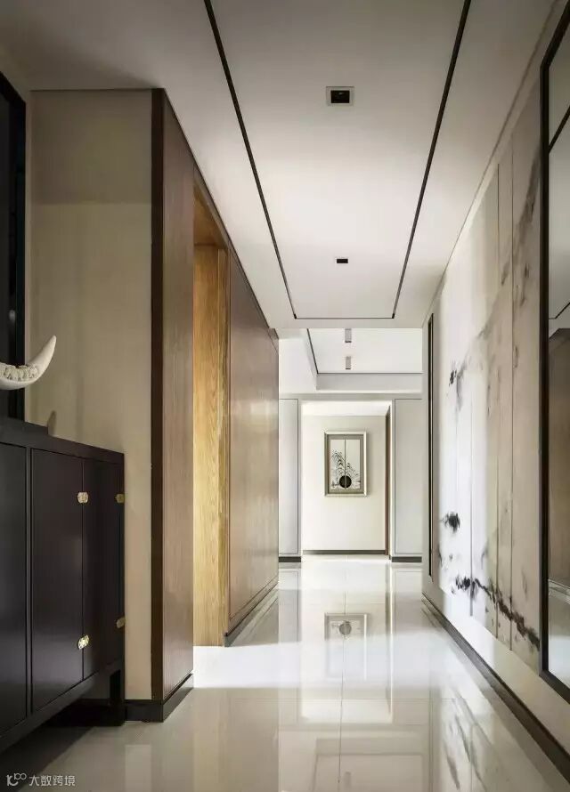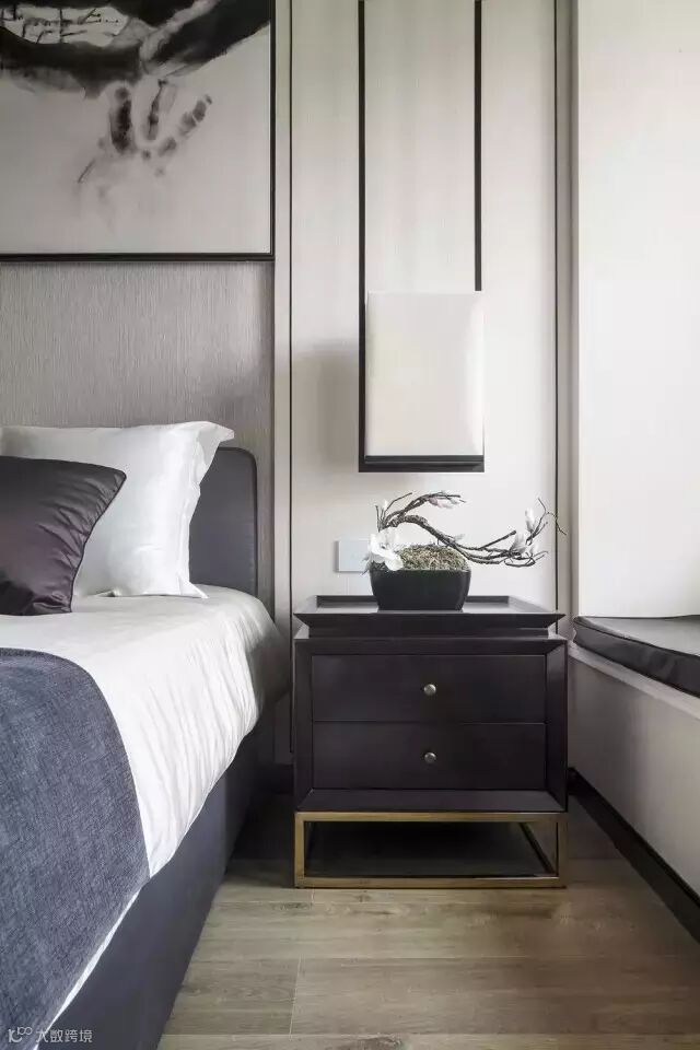 从入口处一面墙的写意水墨淡淡的从远处慢慢渗入,于是,会客厅沙发背景、走道尽头端景、主卧床头背景以及案几上无意摆放的,都是或多或少、或重或轻的写意水墨,行云流水,一气呵成。
