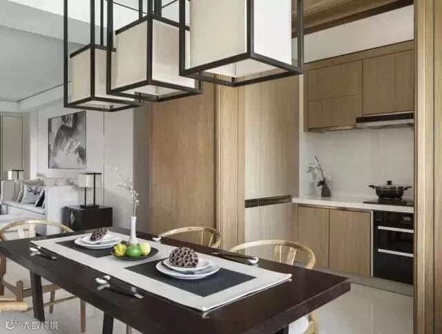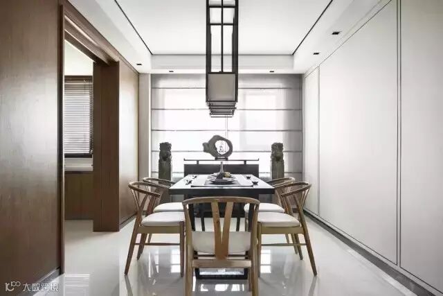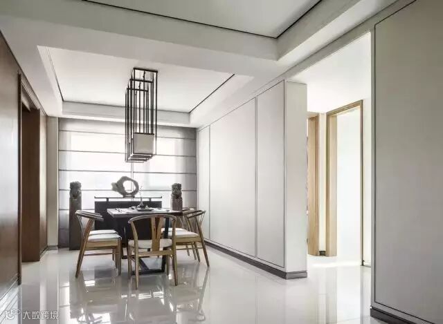 整个材质关系和色彩变化上是平缓过渡而舒畅的,大面积留白墙面,局部墙面处理成金丝楠整块木饰面衔接厨房内部用材,会客区电视墙面小块面压深是为了节奏的变化及功能的需要,就像呼吸均匀而平缓的两个人席地而坐,对弈。