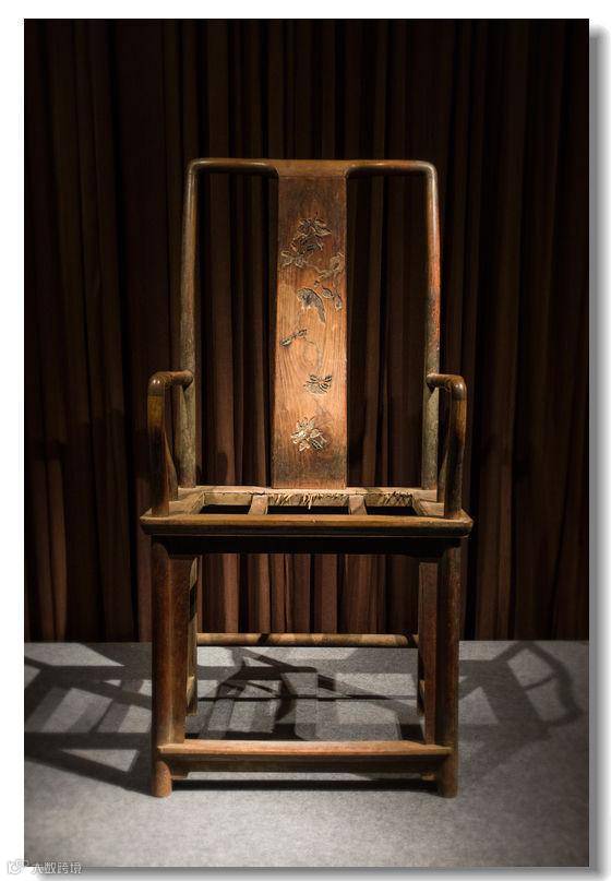 此类百宝嵌的南官帽椅,传世所见的目前仅十一件。该椅因年代久远而缺失,但残留的轮廓依然清晰。造型文件峻峭,各个部位处处用心,比例极佳,为高手所制。