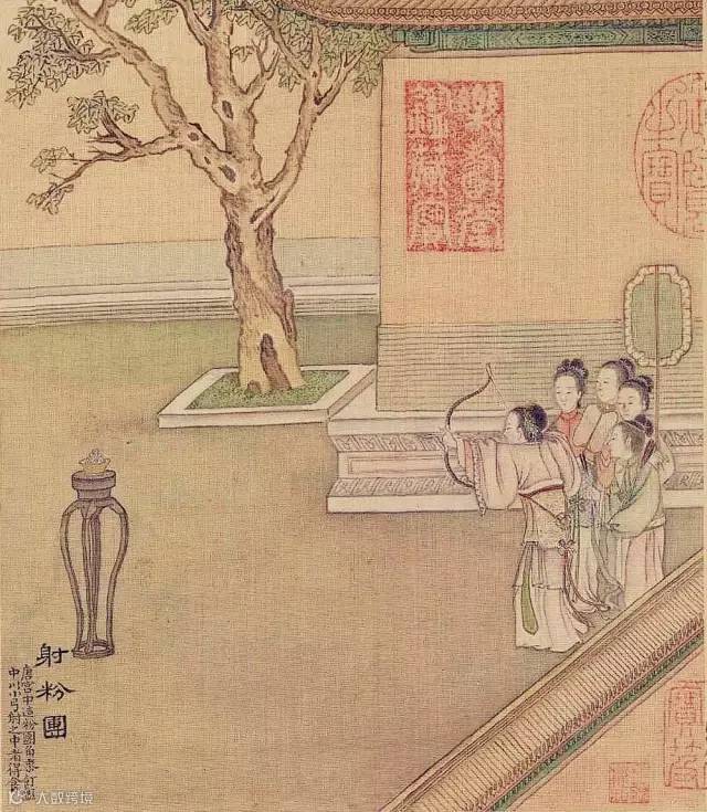 射粉团是一种唐代都城和宫廷盛行的游戏。《开元天宝遗事》记载:“宫中每到端午节,造粉团、角黍,贮于金盘中。(角黍就是粽子,而粉团则是类似麻团的一种点心,用糯米制成,外裹芝麻,置油中炸熟)以小角造弓子,纤妙可爱(说明这种游戏的参与者多为女性或者儿童),架箭射盘中粉团,中者得食。盖粉团滑腻而难射也。都中盛行此戏。”