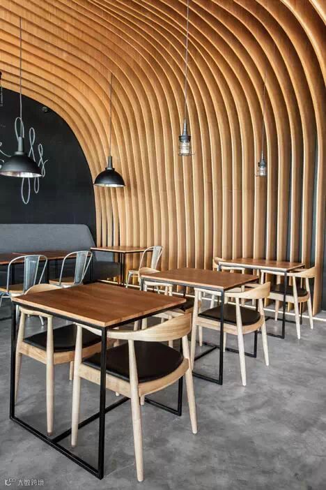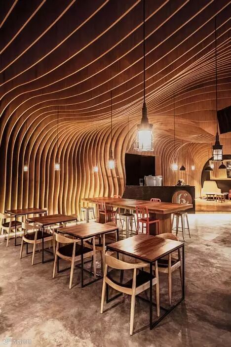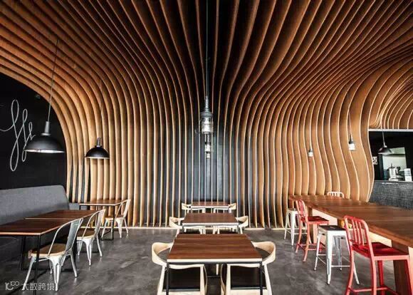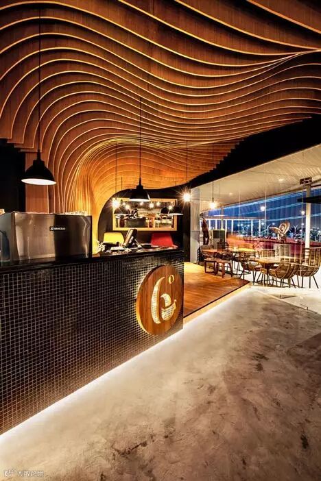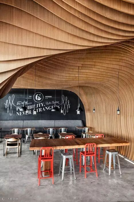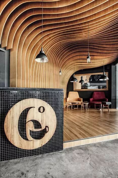 起伏的木材层创建一个类似洞穴的内部设计安装了,波浪木材板条在墙壁和天花板的咖啡馆,坐落在一个购物中心在雅加达。这个咖啡馆叫六度咖啡馆,这是命名的“六度分离”理论——世界上所有人所有事都是由六个或更少的步骤。