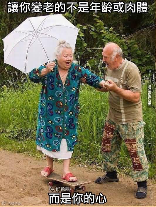 这张图告诉我们:即便是变老,即便是在学习滑板车,女人也绝对忘不了打伞防晒!!!