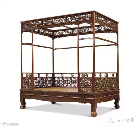 ▲黄花梨簇云纹马蹄腿六柱式架子床