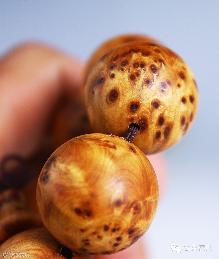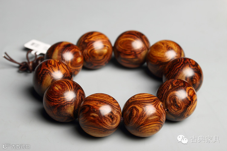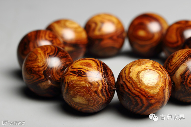黄花梨是目前木质手串中最受追捧的材质。有海南黄花梨(“海黄”)和越南黄花梨(“越黄”)之分。黄花梨手串多是用黄花梨的树根料或枝杈料做成,因为这两种料经常有节和疤,会产生漂亮的木纹理,做出的珠子会出现各种花纹,依据花纹的颜色和形状,称之为虎皮纹和鬼脸纹。