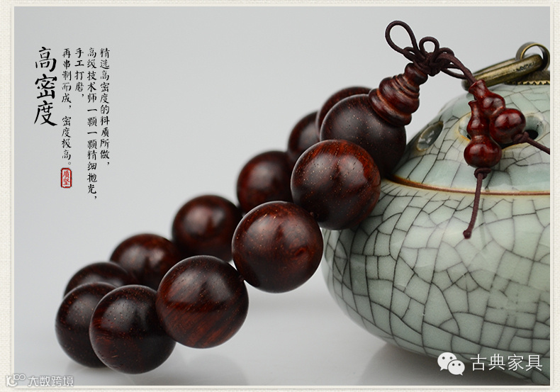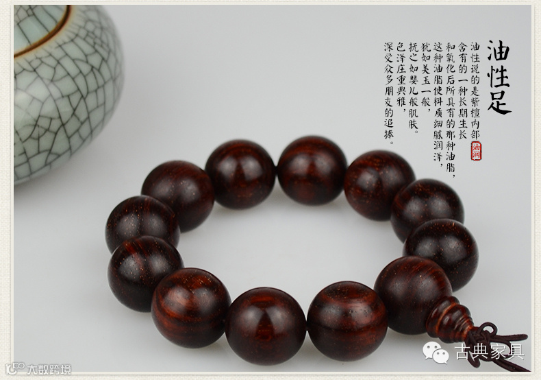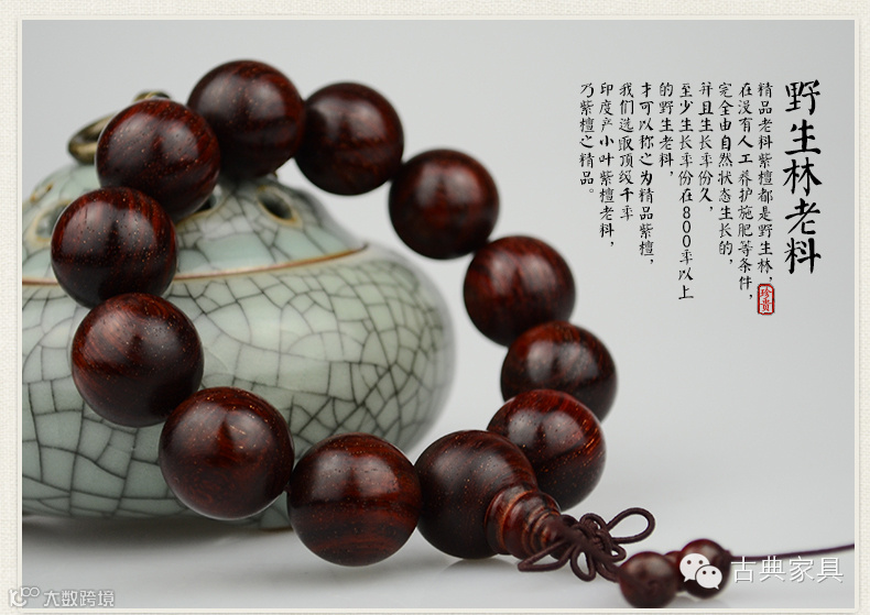 紫檀手串是在目前手串中仅次于黄花梨的上品,由于木材名贵,所有用下脚料做成的手串依然有着名贵的血统。由于容易氧化,盘戴的时间越长就会变得越黑,木纹显得就不是那么重要了,其木纹的标志特点就是牛毛纹和金星。