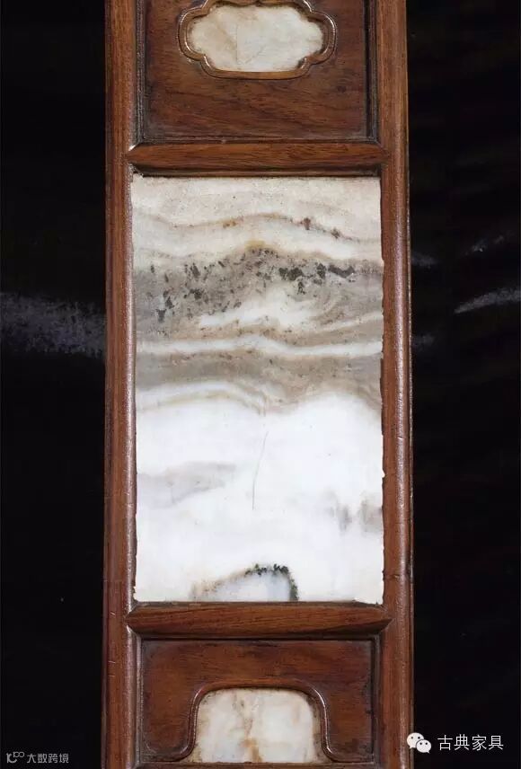 厚宝的靠背板上端露明榫,为三段攒框打槽装板,其上段落堂镶平板,起粗阳线,为如意形开光,内平镶灰纹大理石。背板的中下段皆呈长方形,结构与上段相同,唯下段落堂以U形开光,亦平镶大理石。靠背板后仍存原髹厚漆保护层。