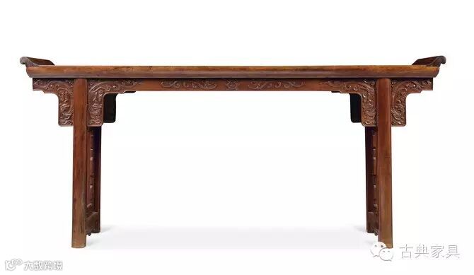 描述: 此案黄花梨制,案面采用一块整板,纹理美观,莹素如玉,两端嵌入造型优美的翘头,灵动飞扬,边抹冰盘沿至底压线。方材腿足以双榫纳入案面底端,香炉退,边沿起灯草线。夹头榫嵌夹铲地浮雕螭龙纹牙板,牙头螭龙飞旋回首,遥相呼应,牙板中段铲地浮雕双螭捧寿纹,灵活生动,呼之欲出,行刀若走笔颇见功力。雕花券口,由四块铲地浮雕云纹的厚木条构成,具壸门之形,取得华丽的装饰效果。这是一件有代表性的大型条案。不仅体现了明式家具制作工艺的精湛,更体现出制作者的匠心独运。具有丰富的历史人文气息。