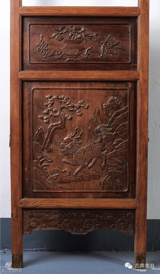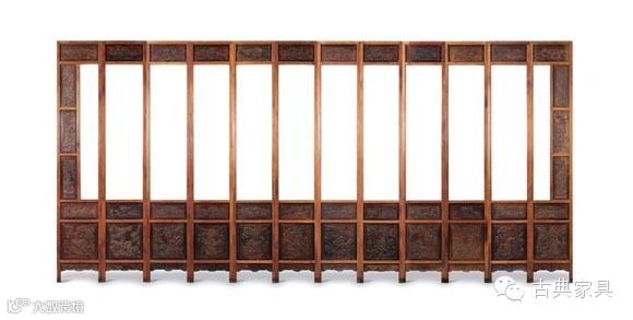 此套隔扇取黄花梨木色和红木木色深浅对比之美,以细致的雕饰和完美的比例取胜。