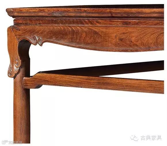 该方桌按照王世襄先生的研究,此种形式称作“矮桌展腿式”,此种形制并不限于方桌,可见同种造法的半桌。其自肩部以下约一尺许的地方造成三弯腿外翻马蹄,看起来像一具接腿的大炕桌。以下则为光素的圆材直腿。桌面底部设穿带支撑,冰盘沿作打漥处理,至底部起线,可见透榫。牙板做成洼膛肚形式,并琢出牙角,边沿灯草线延伸至展腿,流畅优雅。牙子以下罗锅枨齐头碰与圆材腿足相接。