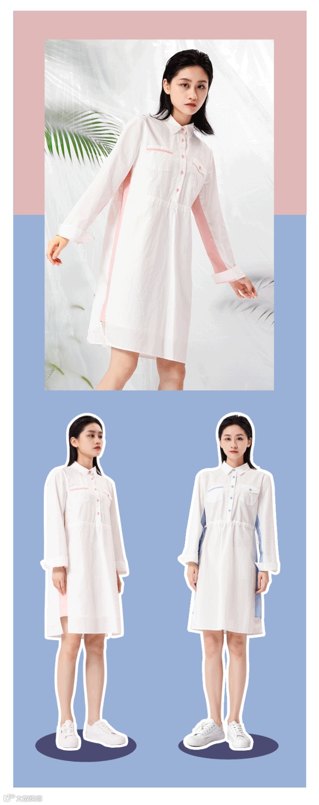 主体白色,侧边粉色或蓝色条形撞色