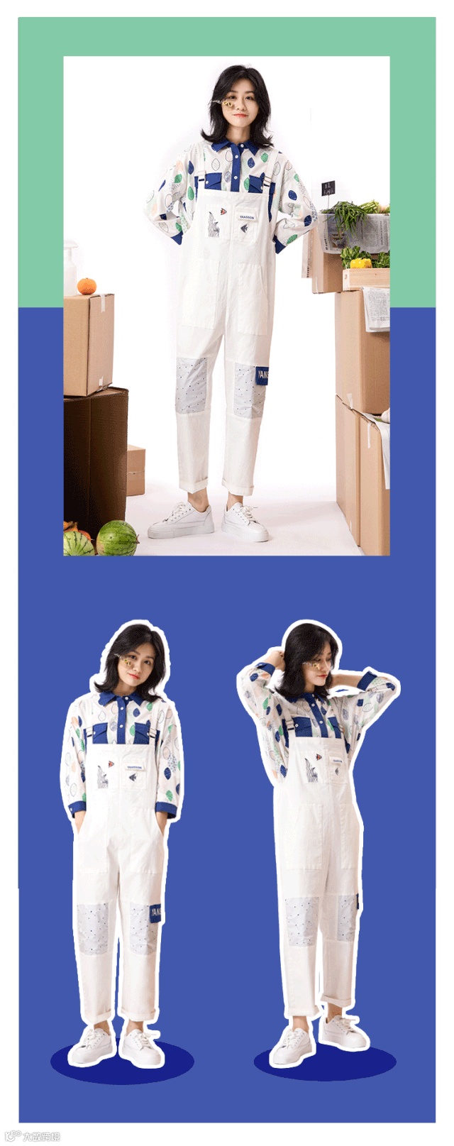 白色直筒吊带裤,膝盖部位使用镂空撞色设计