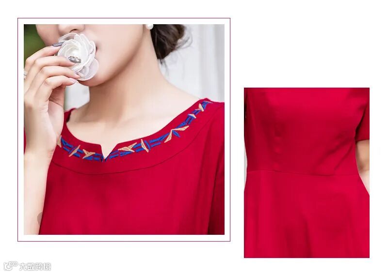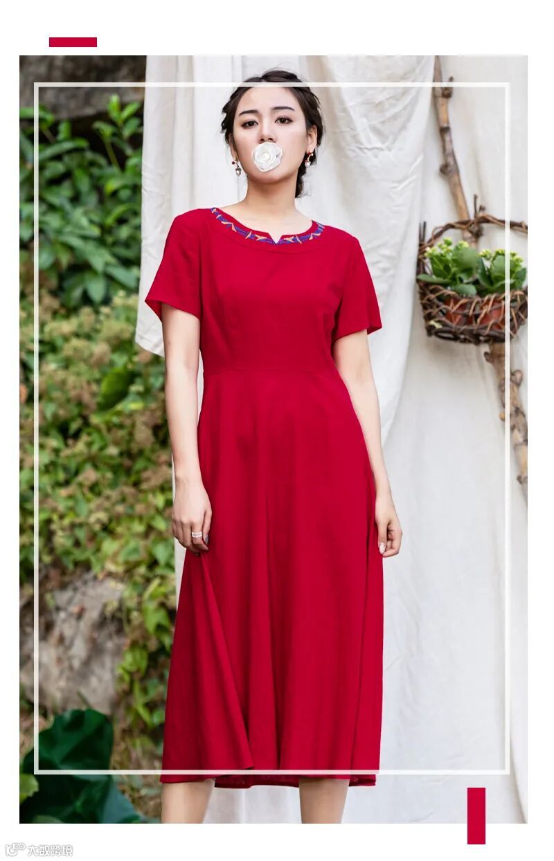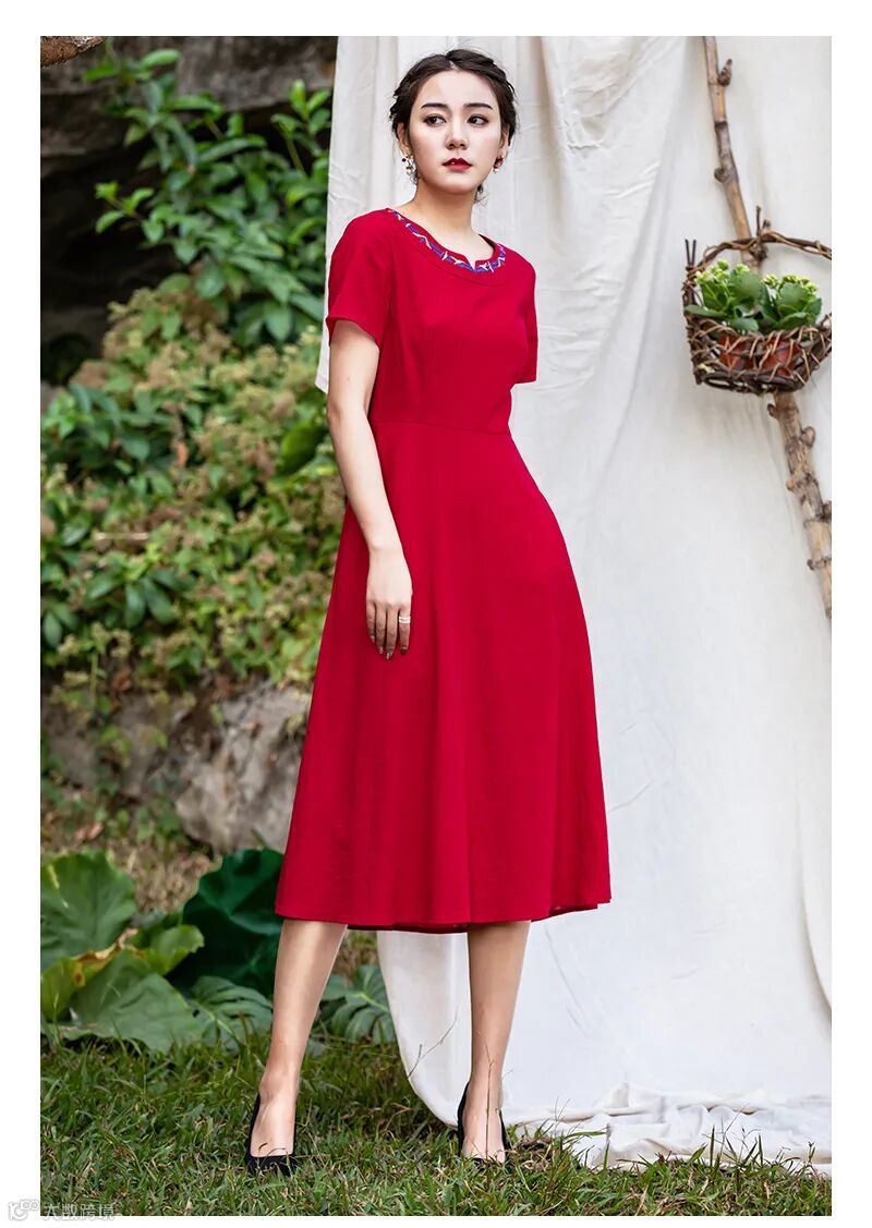 绣花圆领搭配中国红裙身