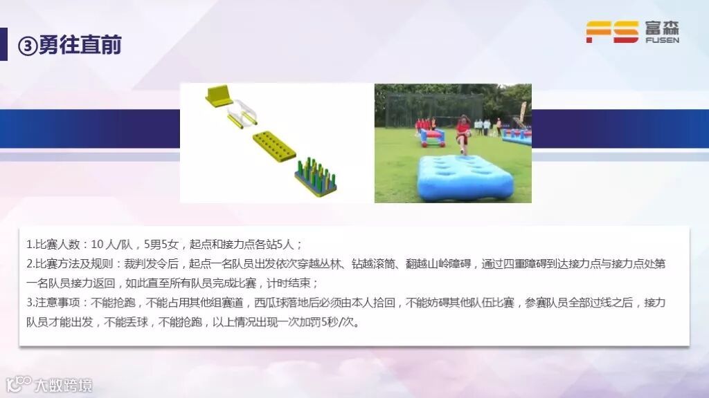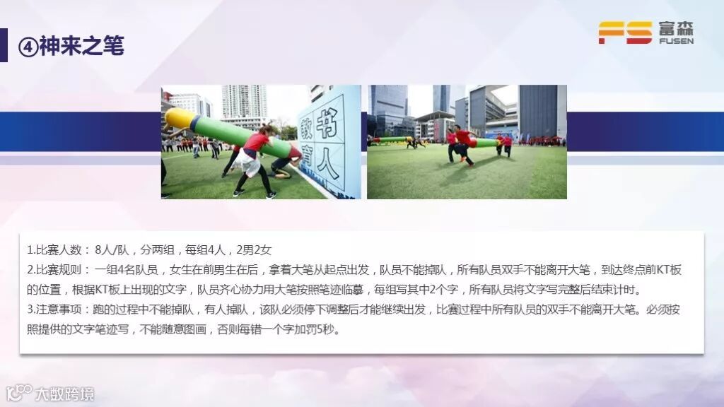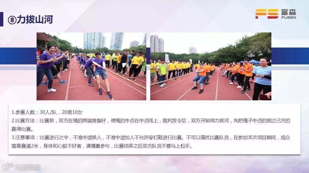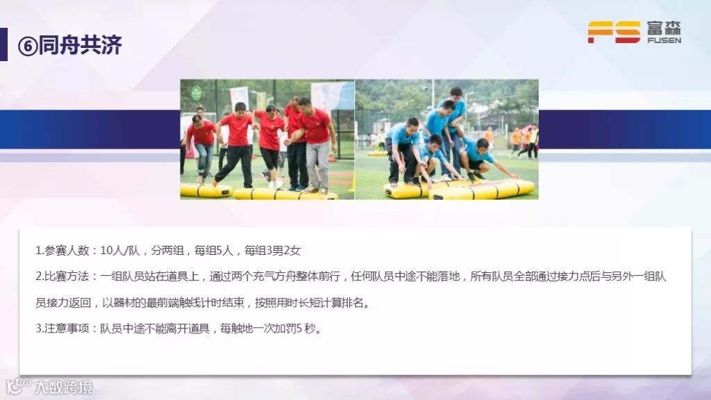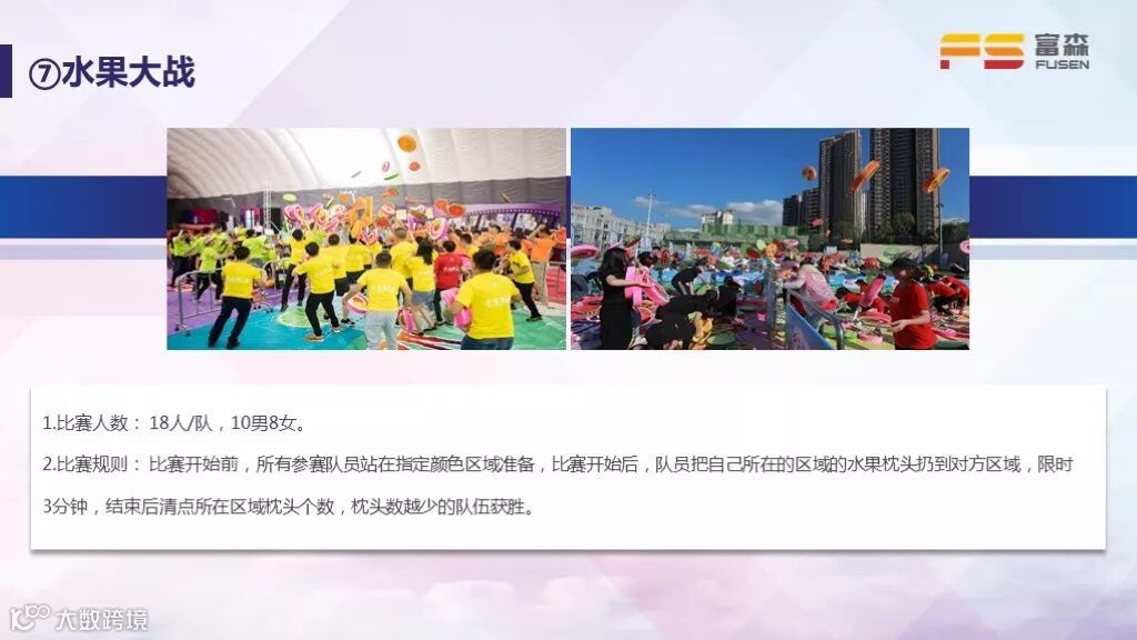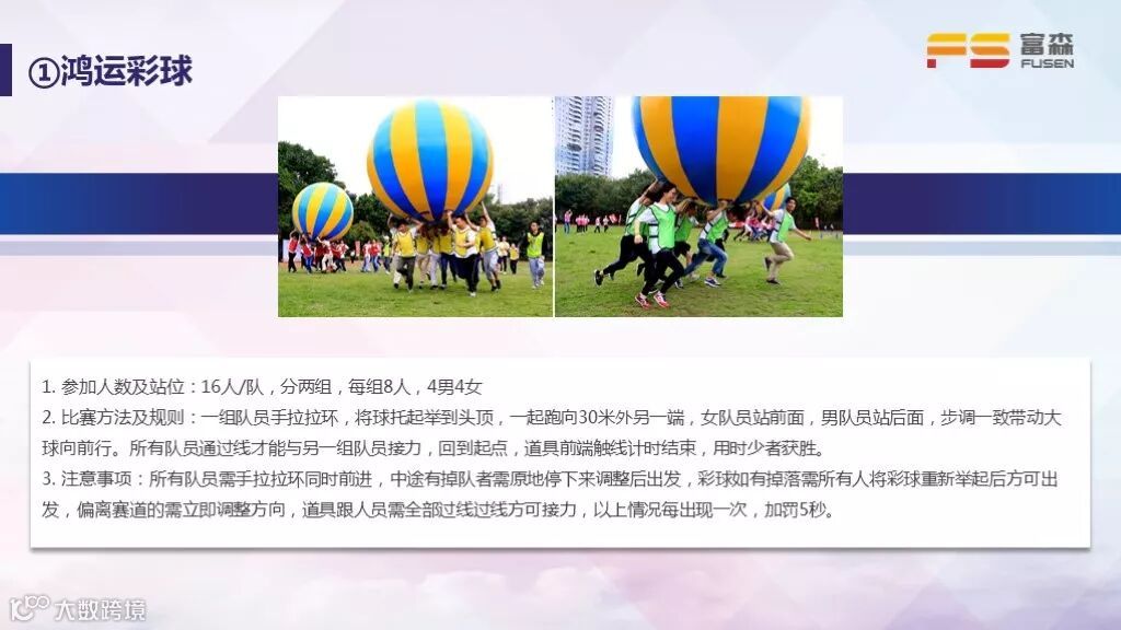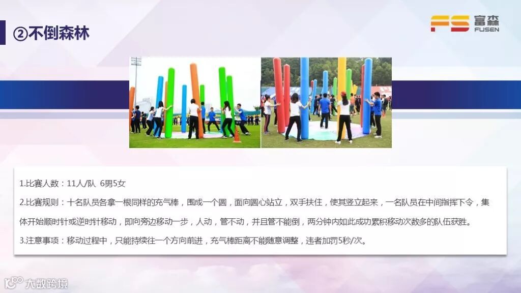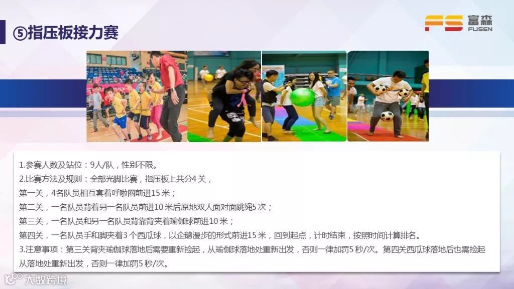 五、活动项目:鸿运彩球、不倒森林、勇往直前、神来之笔、指压板接力赛、同舟共济、水果大战、趣味拔河