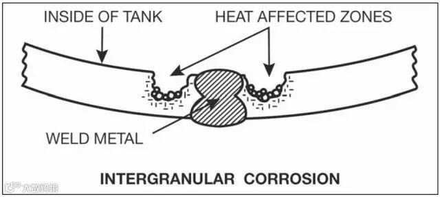 图6 装有腐蚀性介质的水槽里,在焊接热影响区发生了晶间腐蚀。使用含碳量低的或者特殊合金化的焊材可降低碳化物析出倾向,并增强耐蚀性。