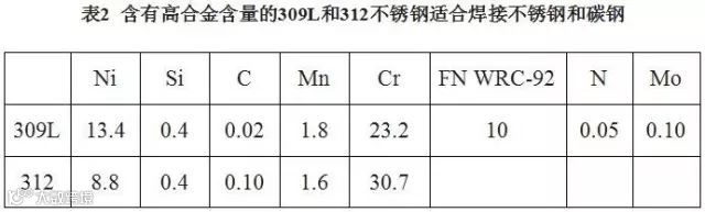 焊接碳钢和304或316不锈钢时,以及其他异种不锈钢焊接时(表2),多数情况下考虑选用309L焊材。如果希望得到更高的Cr含量,则选用312型。